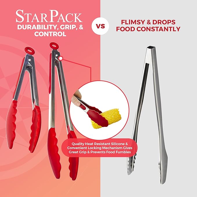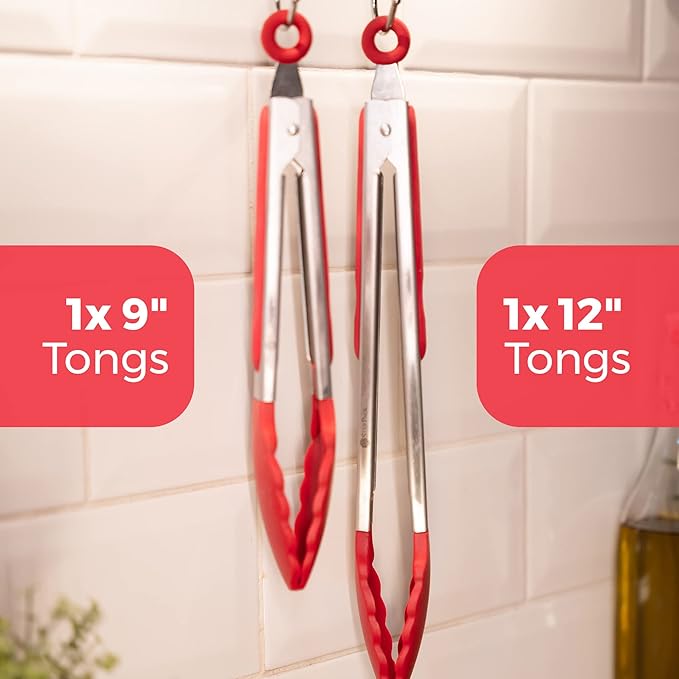 StarPack Premium Silicone Kitchen Tongs Set of 2 (9-Inch & 12-Inch) - Stainless Steel with Non-Stick Silicone Tips, High Heat Resistant to 480°F, For Cooking, Serving, Grill, BBQ & Salad (Cherry Red)