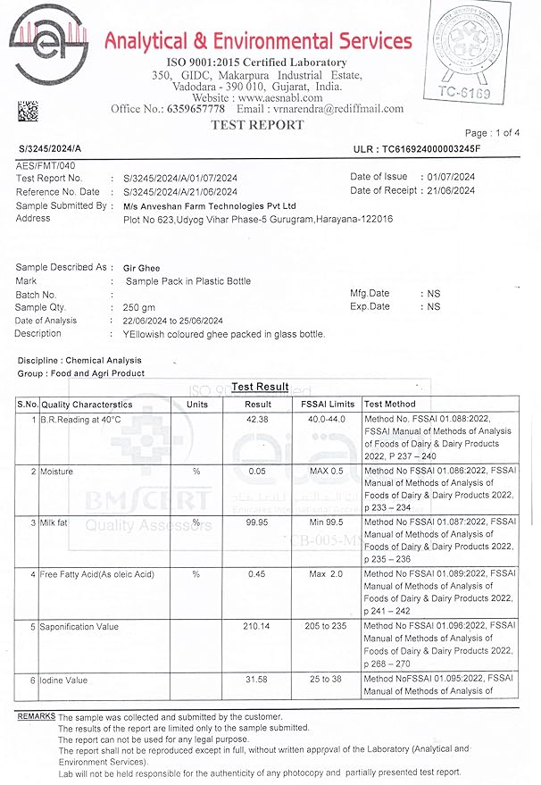 - LAB-TESTED GHEE: We perform a total of 17 lab tests on our A2 Desi Gir Cow Ghee to make sure that every batch of our ghee undergoes strict quality checks.
