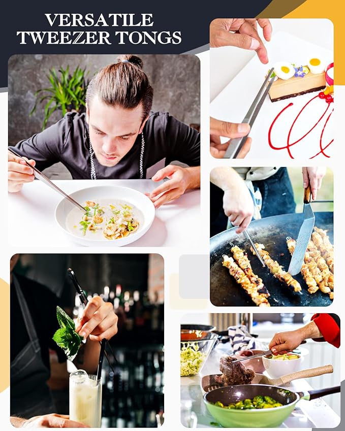 - VERSATILE TWEEZER TONGS: Our tweezers are ideal kitchen tools for precise and detailed cooking tasks, such as handling delicate food, decorating dishes, decorating cakes, cooking flip stir, items, protecting vegetables, gyoza, and egg rolls w/o damaging/ripping them apart, and getting the small food out of the packet or bottle. The Tweezers have a good opening and good resistance, which lends itself to a good enough feel for some delicate tasks