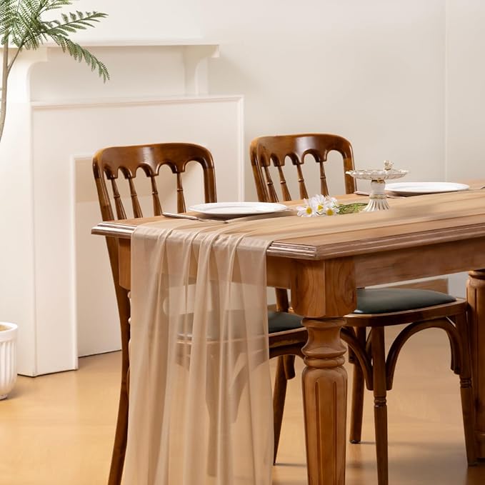 - The edges are carefully stitched to keep a perfect flowing condition. This cheesecloth table runner shimmers a little bit which looks elegant and flowy under natural lights.
