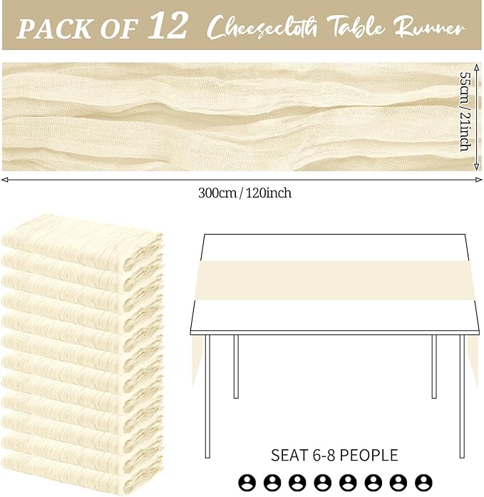 - Package Includes: You will receive 12pcs ivory cheesecloth table runner,enough quantity for wedding receptions and various parties, even can be used for chair sashes or decorative napkins, backdrop pendants and any decor ideas. The ivory table runner has a rustic and elegant appearance, and the natural wrinkled texture perfectly decorate your event, provide an elegant dining environment, and make your event impress your guests.
