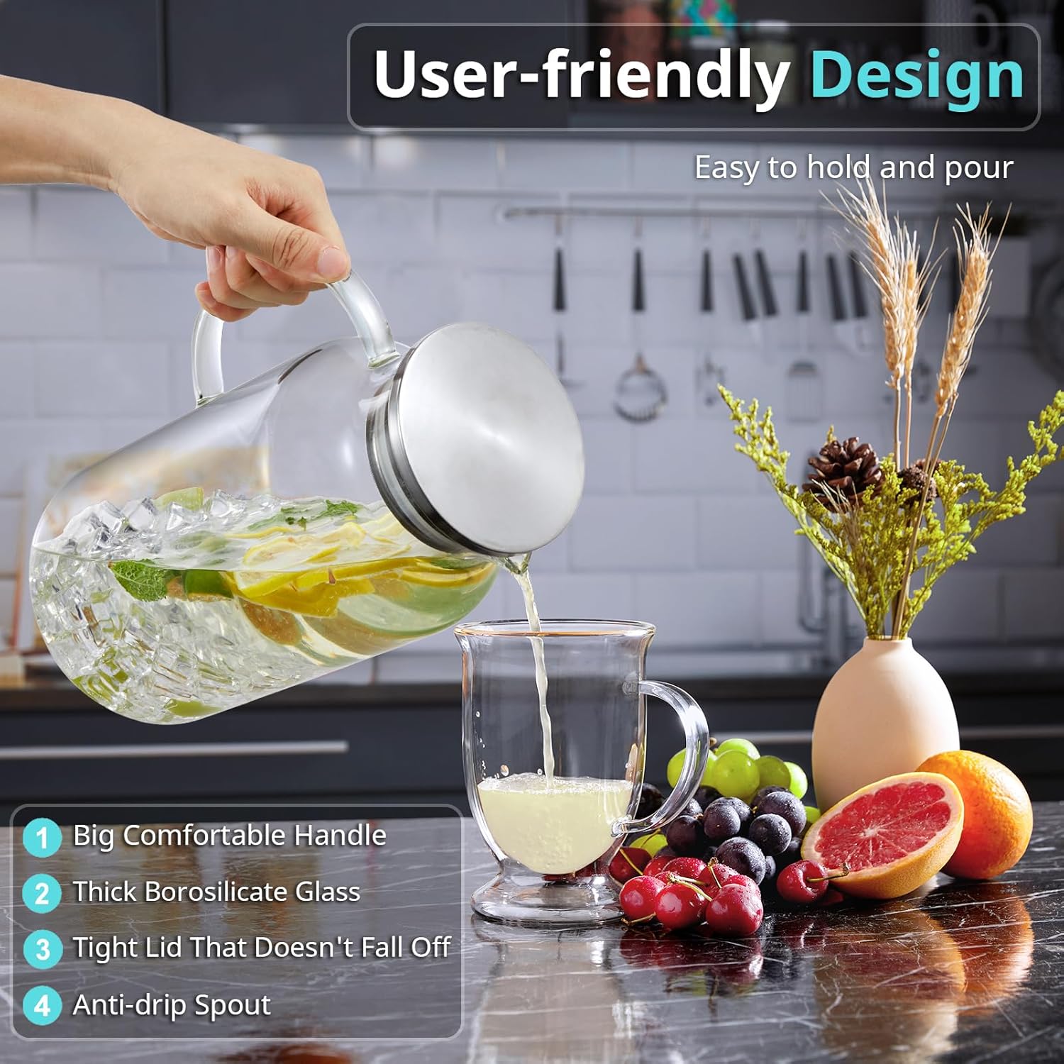 - High Borosilicate Glass: The water pitcher is made of heat resistant Borosilicate glass and can withstand temperatures -4 to 302 degree F, so you can also use it to hold and dispense hot and cold liquids safely than other materials. Drinking from glass tastes better, enjoy a better tasting beverage with our water carafe. The glass pitcher with lid doesn't stain, and won't absorb odor or color, can ensure years of use.