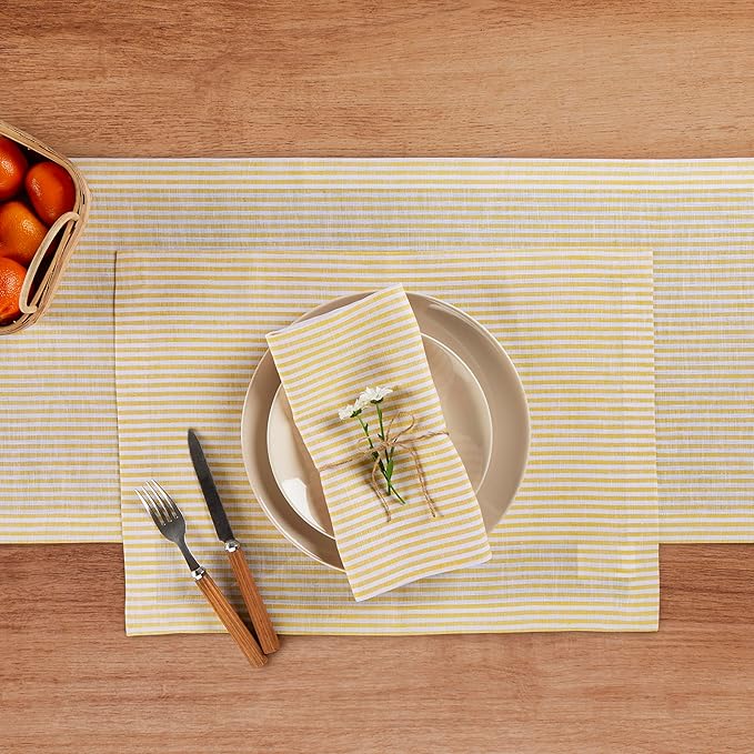 - ๐๐ผ๐บ๐ฝ๐ผ๐๐ถ๐๐ถ๐ผ๐ป ๐ฎ๐ป๐ฑ ๐๐ฟ๐ฎ๐ณ๐๐๐บ๐ฎ๐ป๐๐ต๐ถ๐ฝ : 100% Pure European Flax Linen Spicy Mustard and White Table Runner - ๐ก๐ฎ๐ฟ๐ฟ๐ผ๐ ๐ฆ๐๐ฟ๐ถ๐ฝ๐ฒ | Handcrafted By Skilled Artisans.