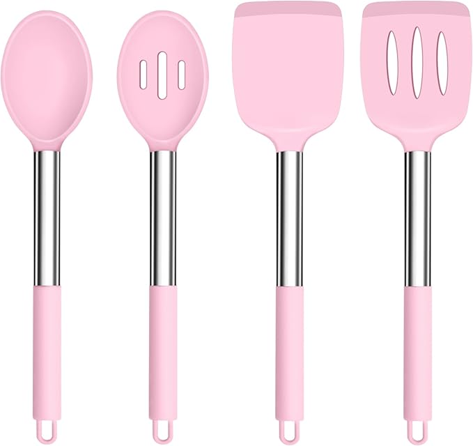 - THOUGHTFUL DESIGNS – The stainless steel handle covered with silicone sleeve for better insulation and non-slip handle is ergonomically for a comfortable grip, Slotted turner and spoon are convenient to strain out excess grease to let you have a healthier meal, Pink and metallic silver construction matches nicely with any color-coordinated kitchen