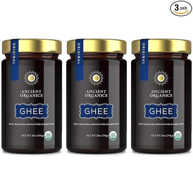 Ancient Organics Ghee - Organic Grass Fed Ghee Butter, Gluten Free, Clarified Butter, Vitamins & Omegas, Lactose Reduced, Kosher, USDA Certified - 28 Oz (Pack of 3)