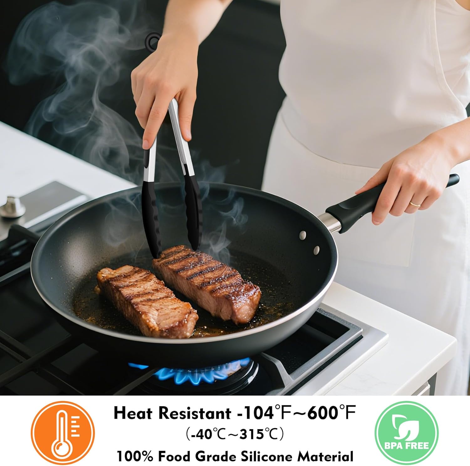- HEAT RESISTANT ERGONOMIC HANDLES: The cooking tongs' handle is cushioned with silicon, good for thumb rest and ensures good grip and control. The Food Grade silicon tongs tip is heat resistance 600°F and less prone to scratch the pan. Easy to rinse, dishwasher safe.