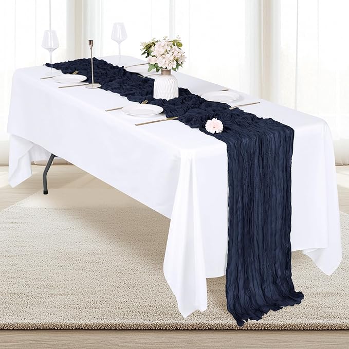 - 【12 Packs 9ft Table Runners】The package include 12 packs 9ft length navy blue table runner, the quantity is sufficient for your daily use and baby shower, wedding or your parties decorations. All the navy blue cheesecloth table runner are 17 inches wide and 108 inches long, which is large enough to cover most kinds of tables, or be put together for longer tables. They can also be used as decoration for backdrop draping, ceiling draping, chair cover sashes and gift wrapping, etc