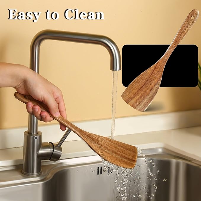 - 【Easy to Clean and Maintain】The surface of this kitchen utensils set is smooth and flat, not easy to get stained by oil and food residues, and it's extremely easy to clean. You can simply rinse it with water or wipe it with mild dishwashing liquid to make it clean again quickly. Meanwhile, to help you better maintain this set of wooden spatula, we recommend applying cooking oil regularly, which can keep the wood shiny and moisturized and effectively prevent cracking