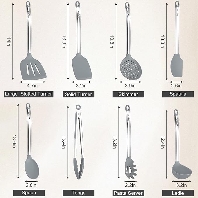 - Premium Heat-Resistant Silicone: Crafted with food-grade silicone heads, our gray kitchen utensils withstand high temperatures (up to 480°F) and resist absorbing food stains, odors, or lingering flavors even under intense heat. Their heat-stable construction ensures safe use for frying, boiling, and baking without melting or warping