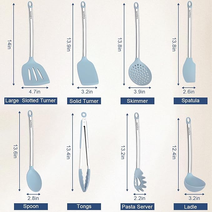 - Premium Heat-Resistant Silicone: Crafted with food-grade silicone heads, our blue kitchen utensils withstand high temperatures (up to 480°F) and resist absorbing food stains, odors, or lingering flavors even under intense heat. Their heat-stable construction ensures safe use for frying, boiling, and baking without melting or warping