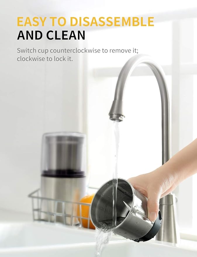 - - Safe & Easy to Clean: Features a safety lid design that only activates the grinder when the lid is properly closed, preventing accidents. The non-slip base ensures stability during use. Both stainless steel cups are easy to disassemble, and you can clean them by rinsing with water, wiping with a damp cloth, or putting them in the dishwasher.
