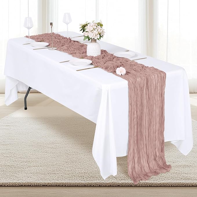 - 【12 Packs 9ft Table Runners】The package include 12 packs 9ft length Dusty Pink table runner, the quantity is sufficient for your daily use and baby shower, wedding or your parties decorations. All the Dusty Pink cheesecloth table runner are 17 inches wide and 108 inches long, which is large enough to cover most kinds of tables, or be put together for longer tables. They can also be used as decoration for backdrop draping, ceiling draping, chair cover sashes and gift wrapping, etc