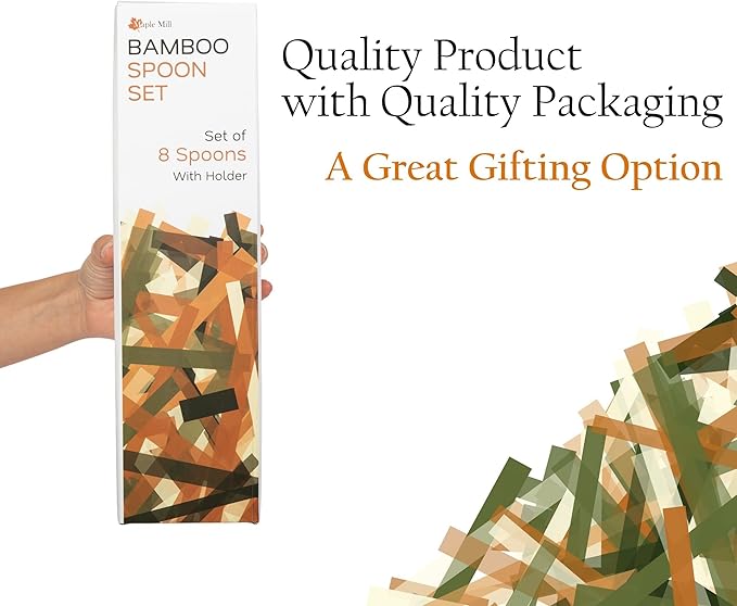 - COMPLETE COOKWARE UTILITY - Set 8 Spoons with holder suitable for every pot and pan. This Bamboo wooden kitchen utensils set ensures effortless flipping, mixing, stirring, and serving of all kinds of food. It's a lightweight wooden spatula set with a sturdy and durable design.